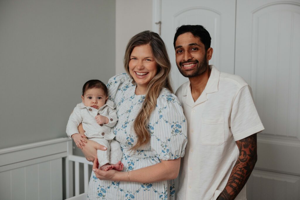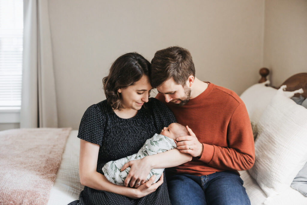 Neutral and earth tones will be your best friends when it comes to outfits for your newborn session. Think of the parents and older siblings wearing white, nude, beige, navy, brown, baby blue, and sage green. We want your new baby to stand out, and they will likely have a few outfit changes, some of which may be pink or blue swaddles, depending on whether you’re having a boy or a girl. If you’re wearing bright colors like orange, red, and yellow, or a flannel, it will make the picture look busy and distracting. Use this family picture above as inspiration. Duke and Lauran included her parents and sister in baby Sybil’s newborn session, and they coordinated their outfits so well!